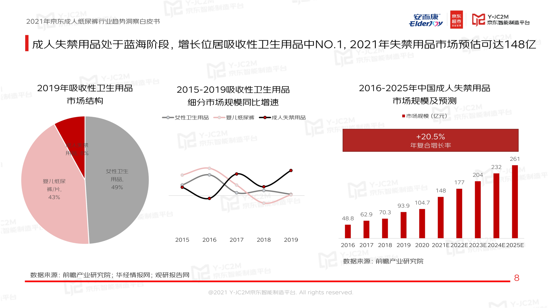 通过《2021年京东成人纸尿裤行业趋势洞察白皮书》的解读,我们不难发现,相较于历经多年发展、已接近或达到成熟期的婴儿护理用品和女性卫生用品行业,国内成人失禁用品行业现在刚刚开始步入成长通道,未来将成长为高增长赛道。综合消费升级趋势下的市场扩容、消费者教育后品牌认知提升等因素的作用,同时伴随养老服务制度在我国的完善,以及成人失禁护理相关福利政策的陆续出台,未来我国成人失禁用品机构渠道与个人需求增长将不断提速,而以彩神集团旗下安而康品牌为代表的国货更将有望凭借产品和先发优势继续领跑。